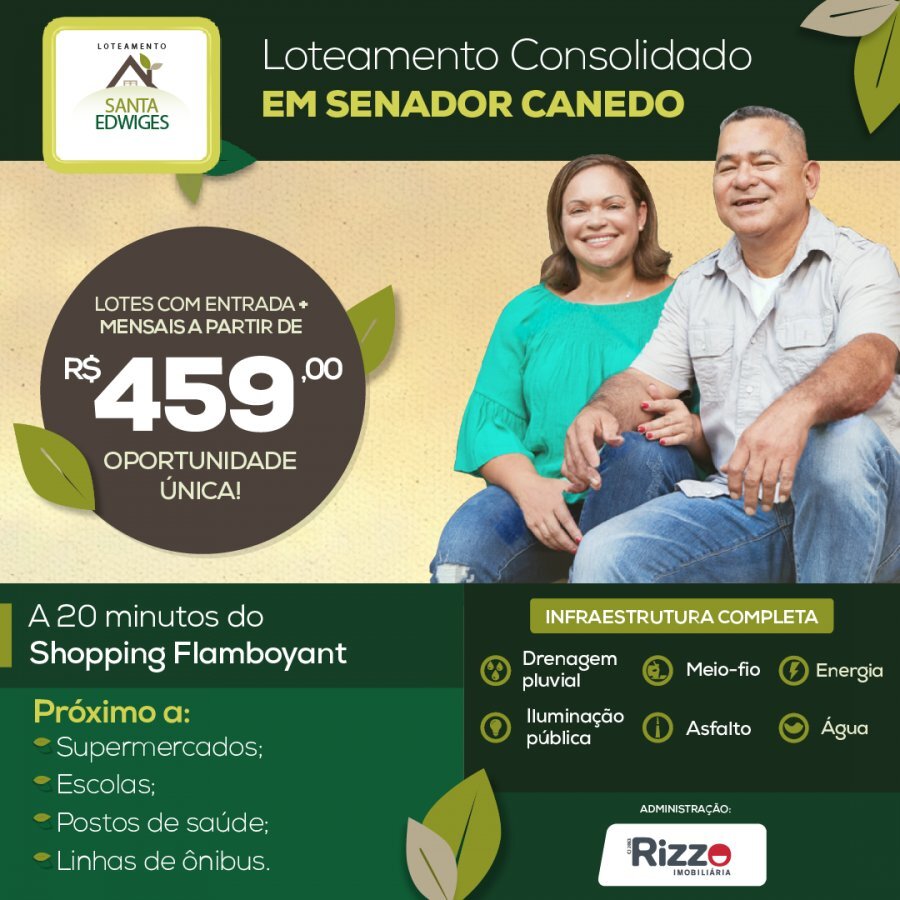 Residencial Santa Edwiges é um loteamento localizado às margens da Avenida Progresso que é a novaligação entre Goiânia e Senador Canedo e região de expansão de condomínios horizontais. O loteamento já consolidado, com infraestrutura completa, linha de ônibus, acesso a Supermercados entre outros. São lotes à partir de 200m² e condições de compra facilitada.
